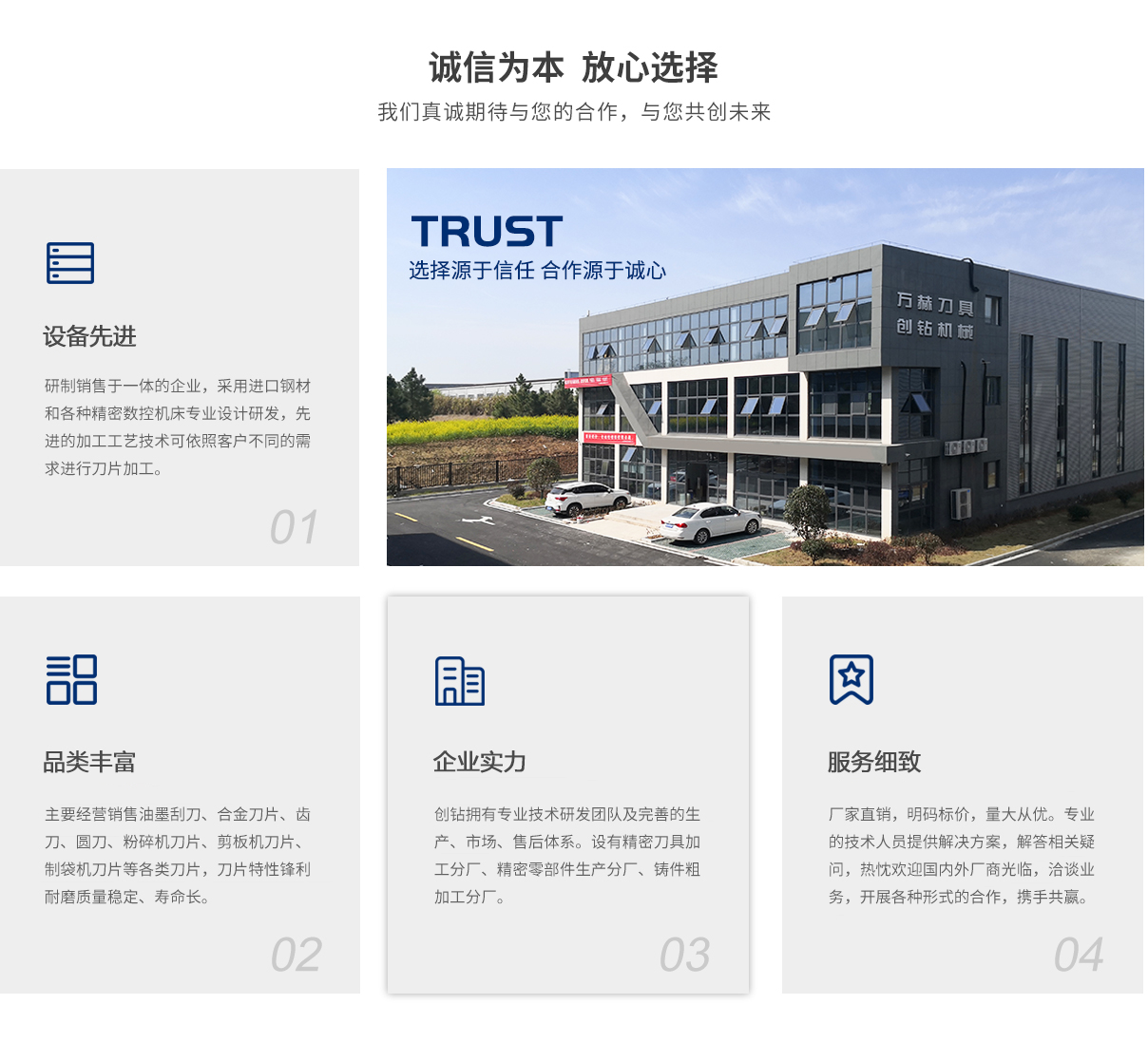 馬鞍山創(chuàng)鉆機械科技有限公司 INTRODUCTION 馬鞍山市創(chuàng)鉆機械科技有限公司(創(chuàng)鉆機械)坐落于鋼鐵之城-安徽馬鞍山,公司擁有專業(yè)的技術(shù)研發(fā)團隊及完善的生產(chǎn)、市場、售后體系。公司設(shè)有精密刀具加工分廠、精密零部件生產(chǎn)分廠、鑄件粗加工分廠,...